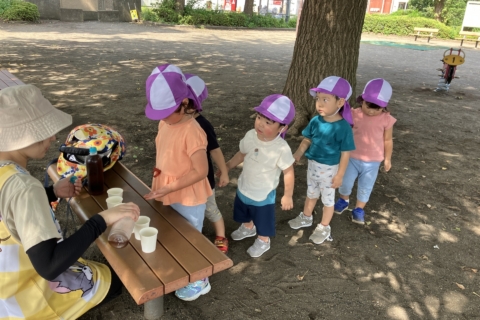 水分補給もお店屋さんごっこで楽しみます! しっかり並んで「お茶くださーい!✨」