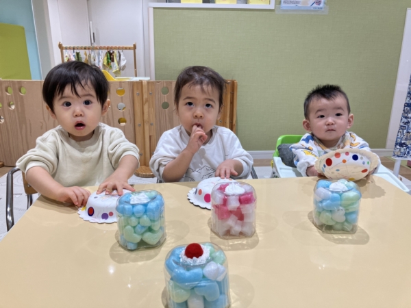 大きくなった蒲公英組の3人、早速製作あそびを楽しんでいますよ♪