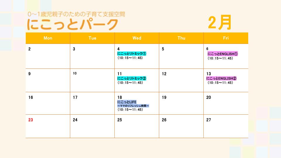TOP > お知らせ > お知らせ詳細 2026.01.26 にこっとパークカレンダー2月 PREV 一覧へ戻る NEW 2026.01.26 相模中央学園 【0~1歳児の皆様へ】2月子育て支援ひろ… 2026.01.20 リクルート 【保育学生さん・既卒の方】園への見学を随… 2025.12.17 相模中央学園 【0~1歳児の皆様へ】1月子育て支援ひろ… 2025.12.16 相模中央学園 【1~2歳児のお子様へ】1月31日(土)… 2025.12.15 相模中央学園 募集終了|【0歳児のお子様へ】12/27… CATEGORY すべて 橘 幼稚園 学童 リクルート 相模中央学園 ARCHIVE 2026 2025 2024 2023 2022 2021 2020 検索