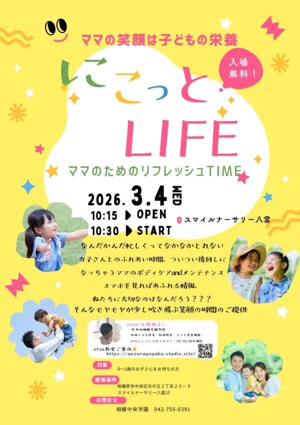 3月 4日(水)10:30~11:45(開場10:15) 『にこっとLIFE~ママのリフレッシュ時間~』