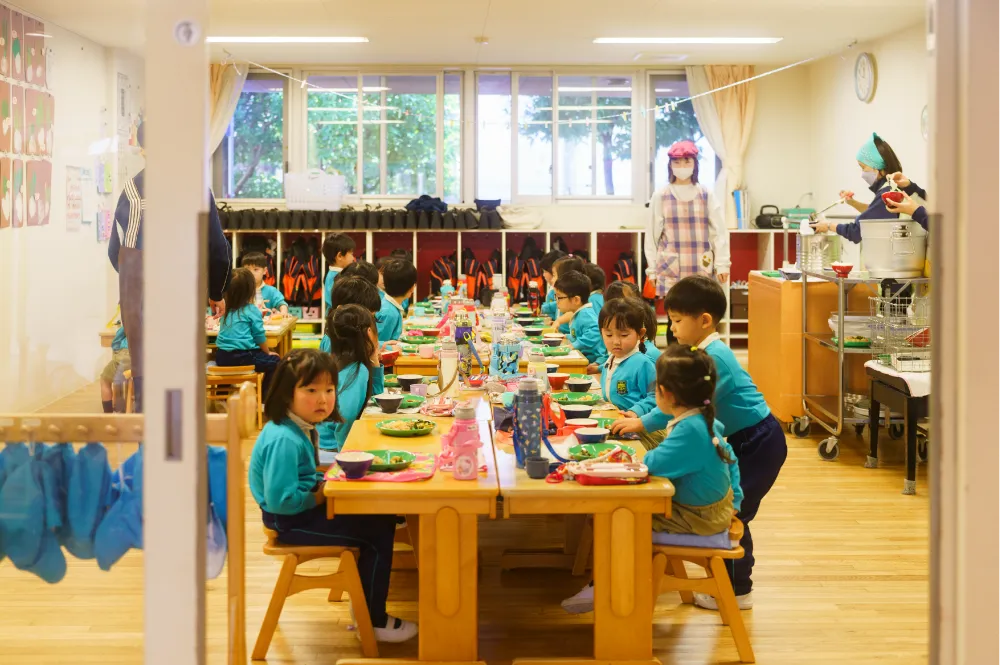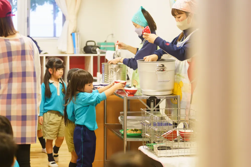 当園は週5回の給食提供をしており、自園の調理室「FUJIYAMA KITCHEN」で作った栄養満点の給食、弁当給食が曜日替わりで食べていただけます。半日授業の時や夏期、冬期、春期などの預り保育時にもランチが注文できます。給食は作っていただいた人に感謝をして、みんなと同じものを食べるという経験を大切にしています。