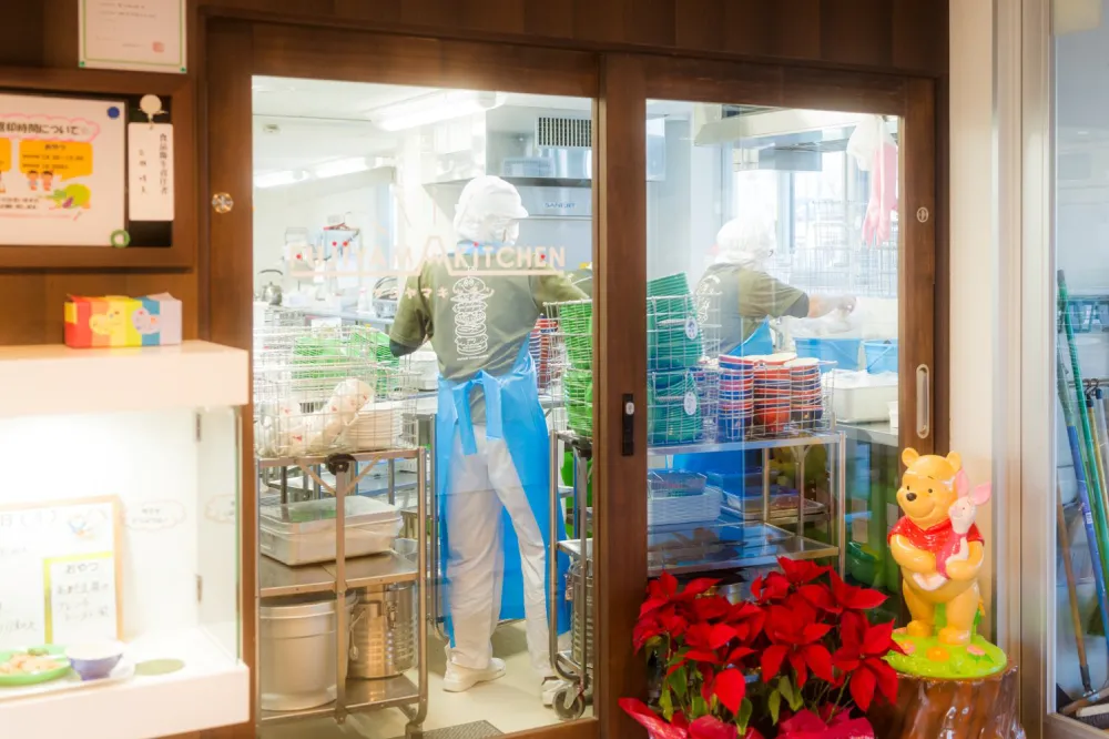 子どもたちができたての給食を食べられるよう新設した、自園調理のための給食施設です。衛生面に気を配り、安全でおいしい給食を作り、子どもたちの成長を「食」で支えています。